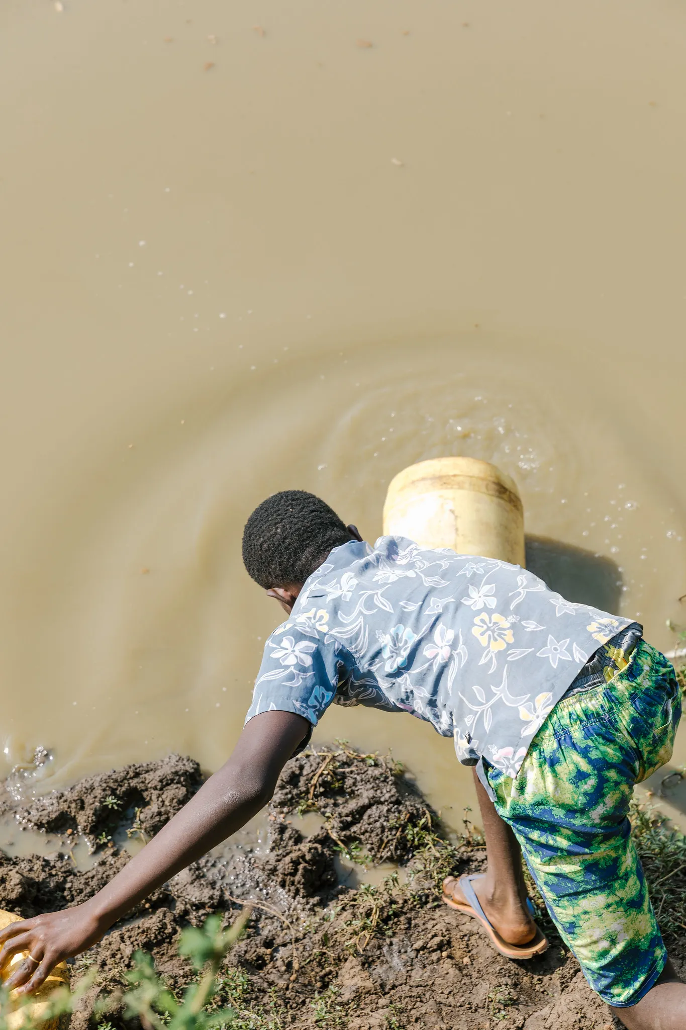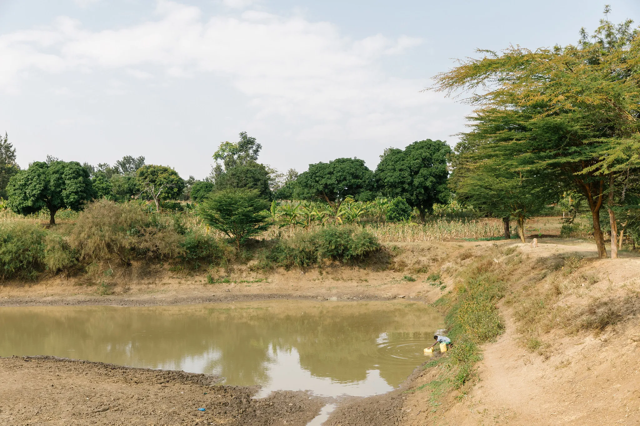 Anthony walks to the pond to gather water.
