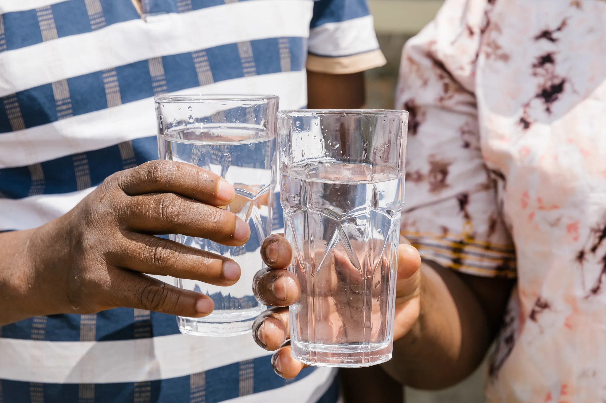 Daniel and Dorcus raise a glass of water from their rain storage tank.